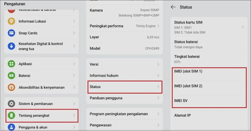 Masuk ke menu Pengaturan > Tentang Ponsel > Status, lalu cari bagian IMEI Information. Di sini akan tertera nomor IMEI dari perangkat.